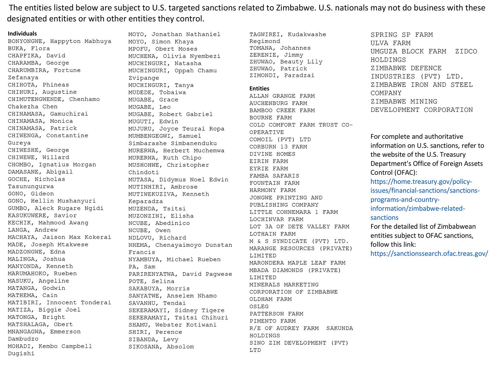 Zimbabwe Sanctions List 2022. Zimbabwe Declares October 25 Sanctions Public Holiday. The Zimbabwe Sanctions program represents the implementation of multiple legal authorities. The Zimbabwe targeted sanctions program began on March 7 2003 when the President of the United States issued Executive Order EO.