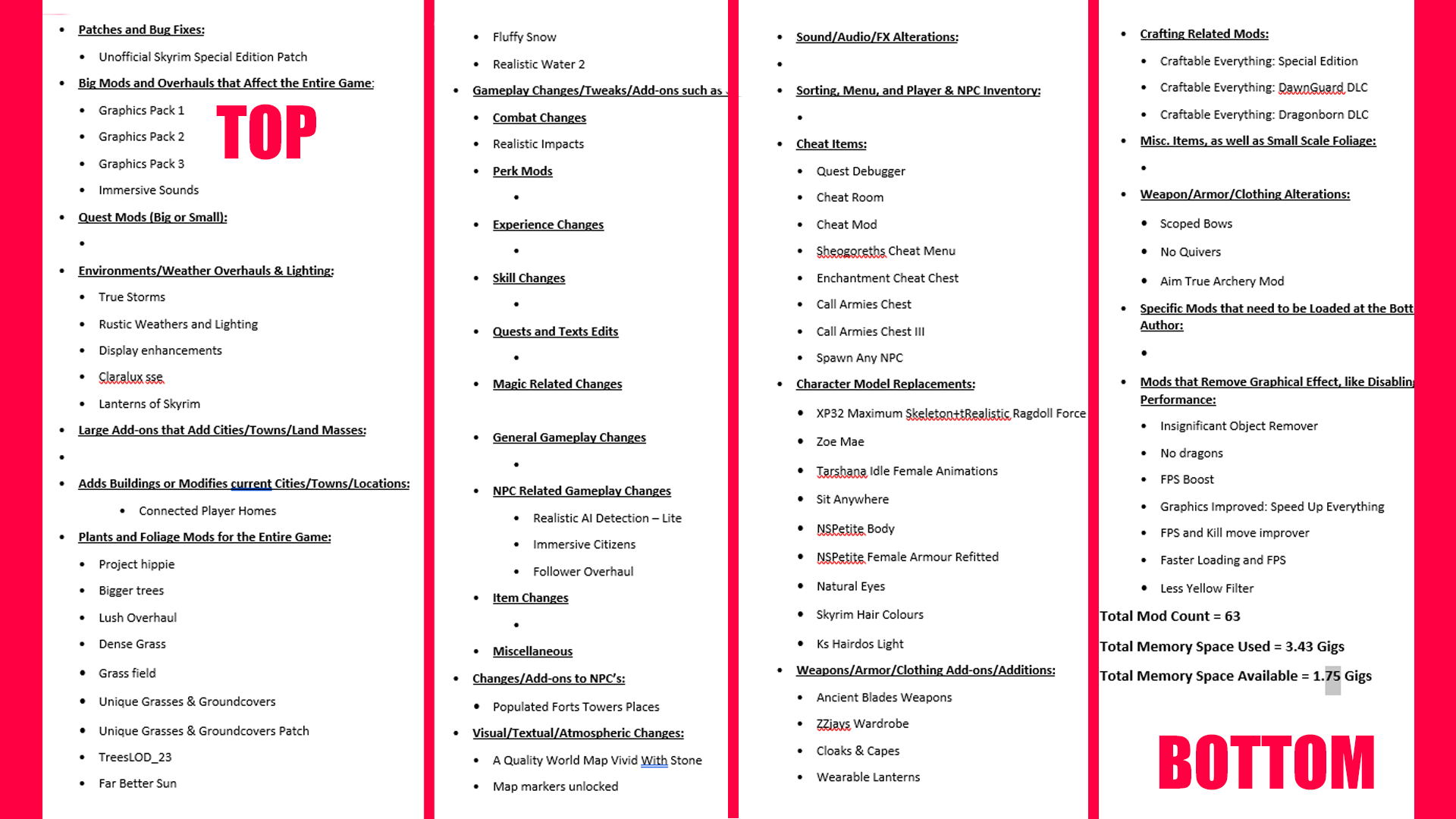 Mods at the top of the list are loaded first. Going over every mod in my list. After so many hours messing around with load orders and trying new mods that work great together I finally found the perfect mod load order for me and hopefully someone whos having trouble can try this one and enjoy it like me. I created a load order list and I wanted to check on here if I did it right.
